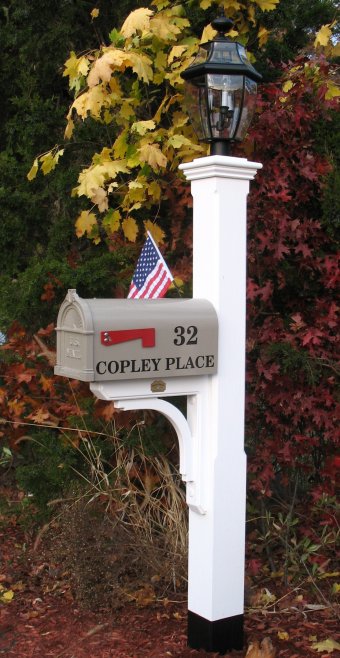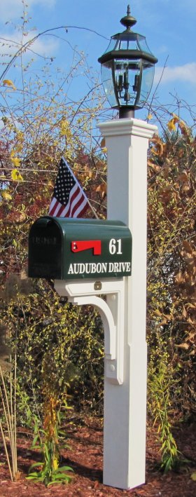 6 1/4" x 6 1/4" x 8' center channeled, wire ready, corner chamfered cedar post with Post Seal wrapped below ground to eliminate rot...guaranteed. Cedar topmount post, lantern post cap with 3 inch diameter universal fixture mounting coupler and cedar mailbox brace finished with 2 coats of oil primer and 2 coats of acrylic latex in white or off-white. Heavy-duty lag bolts for solid brace mounting and hardware cover caps. Providing support for the fixture, our lantern cap with coupler is fastened to the post with four - 4" wood screws driven deep into cedar post.....................$450