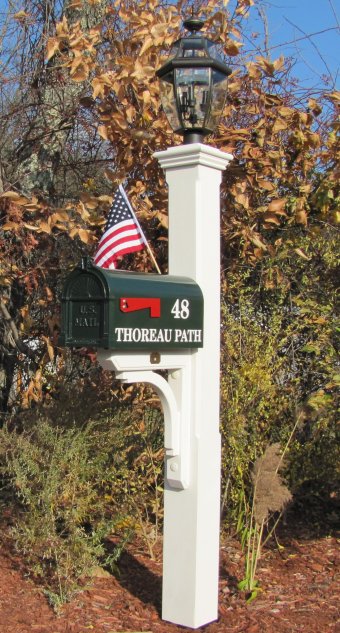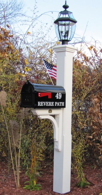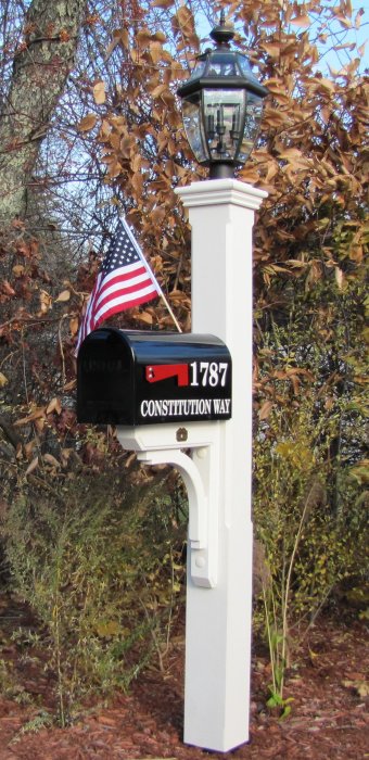 Shown white with black Topmount Lantern fixture with black Patriot mailbox and lettering.