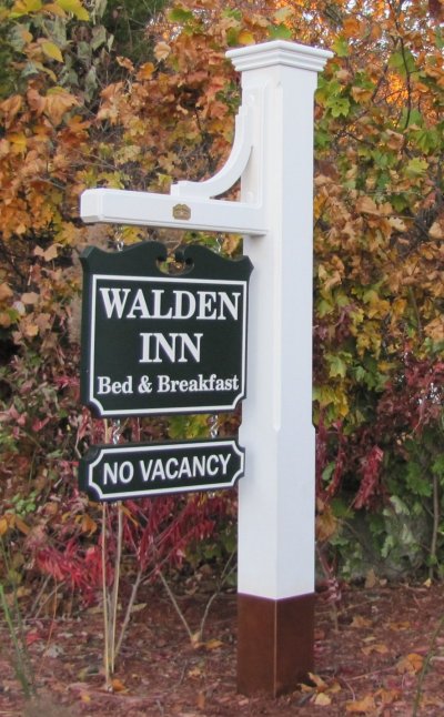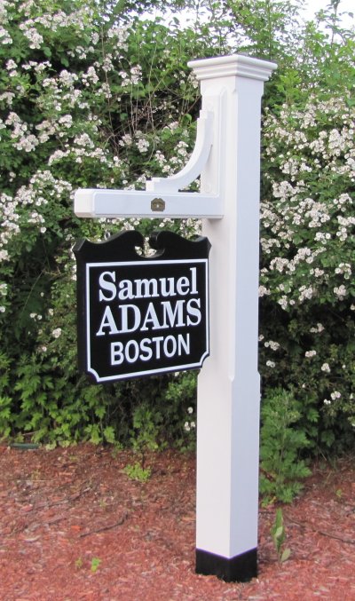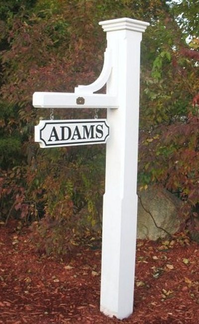 6 1/4" x 6 1/4" x 8' cedar post, wire ready for sign lighting with Post Seal wrapped below ground eliminating wood rot...guaranteed. Cedar post, post cap and cedar sign brace finished with 2 coats of oil primer and two coats of acrylic latex in white or off white. Post cap fastened with premium waterproof adhesive..................................................$440