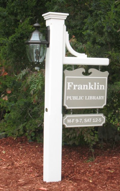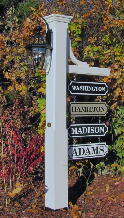 Shown white with black sidemount Franklin lantern fixture and black, taupe, green, and white Quarterboard signs respectively with white, black, reflective white, and black decal respectively.