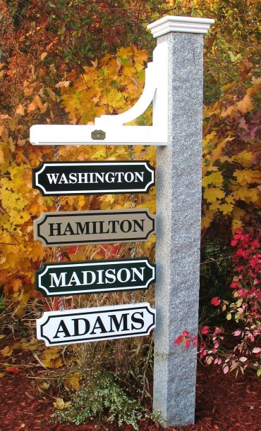 6" x 6" x 8'- 400lbs New England Gray granite post with heavy-duty stainless steel wedge anchors for brace mounting. Cedar - sign brace and post cap finished with 2 coats of oil primer and 2 coats of acrylic latex in white or off-white. Post cap is fastened to granite with premium waterproof adhesive. ......................................$640