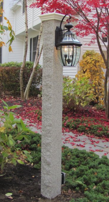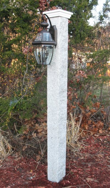 6 x 6 x 8'-400 lbs wire ready center channelled New England gray granite with universal sidemount lantern fixture mounting bracket and cedar post cap finished with 2 coats of oil primer and 2 coats of acrylic latex in white or off-white. Post cap is fastened to granite with premium waterproof adhesive. ............................$760