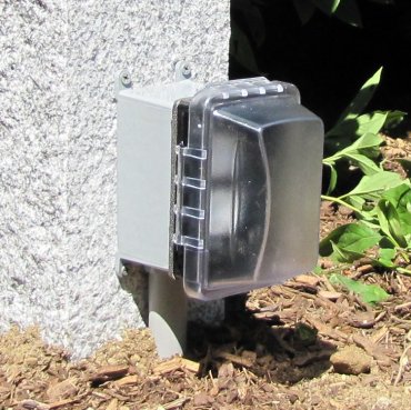 Junction Box with 3/4" PVC pipe, waterproof cover, and GFCI duplex outlet fastened to granite post with screws and expansion anchors.